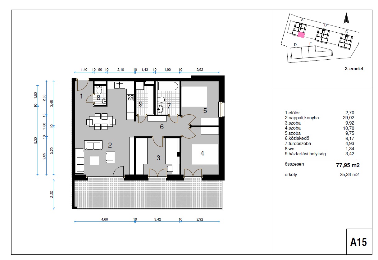A jelen adatok tájékoztató jellegűek, ezért a Beruházó azok változásával, vagy bármely attól való eltéréssel kapcsolatban semmilyen kötelezettséget, vagy felelősséget nem vállal. Az ábrázolt berendezési tárgyak és bútorok, a burkolatok megjelenése nem képezi a szerződés tárgyát. A pontos felszereltség műszaki leírás szerint. A területek burkolatlan felületekre értendőek. A nettó területek helyiségeknek a falak közötti területei. A bruttó területek tartalmazzák a válaszfalak alatti területet. Jelen rajzon szereplő méretek a kiviteli tervek szerint módosulhatnak.