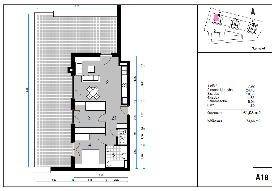 A jelen adatok tájékoztató jellegűek, ezért a Beruházó azok változásával, vagy bármely attól való eltéréssel kapcsolatban semmilyen kötelezettséget, vagy felelősséget nem vállal. Az ábrázolt berendezési tárgyak és bútorok, a burkolatok megjelenése nem képezi a szerződés tárgyát. A pontos felszereltség műszaki leírás szerint. A területek burkolatlan felületekre értendőek. A nettó területek helyiségeknek a falak közötti területei. A bruttó területek tartalmazzák a válaszfalak alatti területet. Jelen rajzon szereplő méretek a kiviteli tervek szerint módosulhatnak.