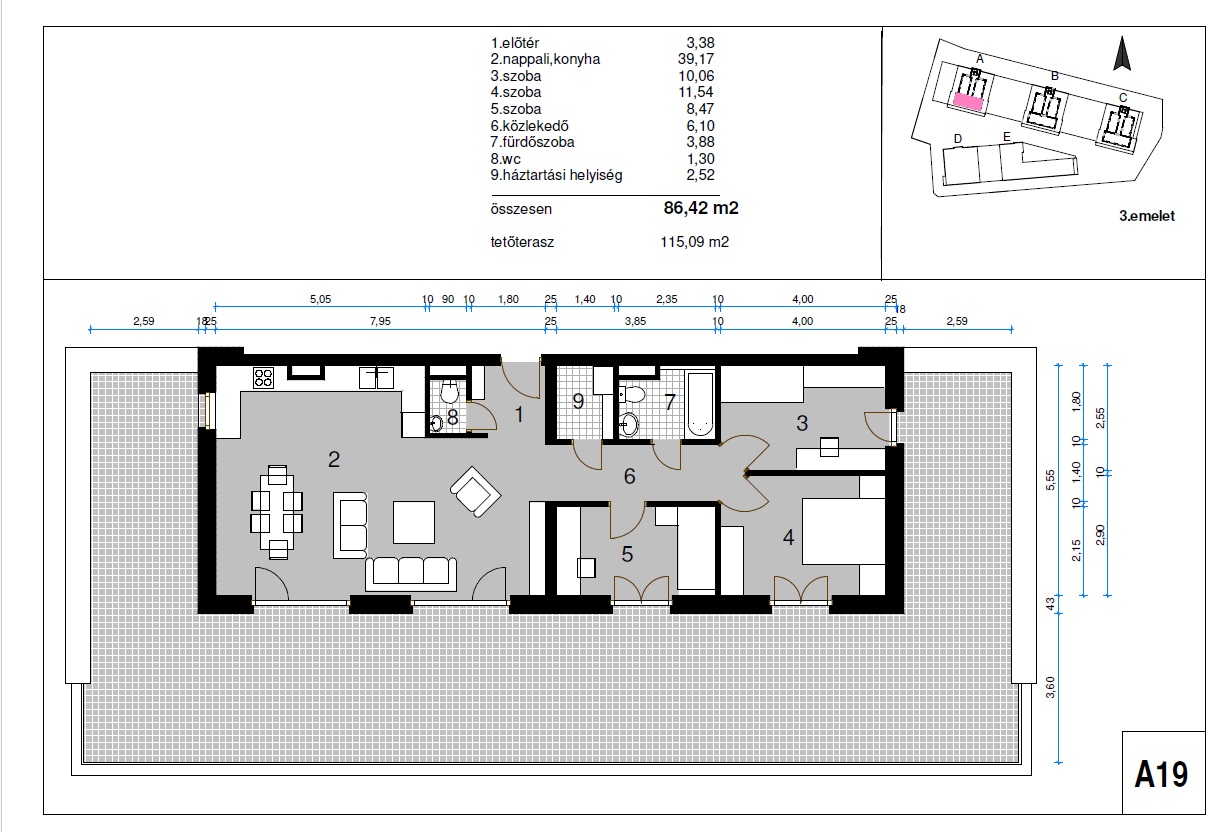 A jelen adatok tájékoztató jellegűek, ezért a Beruházó azok változásával, vagy bármely attól való eltéréssel kapcsolatban semmilyen kötelezettséget, vagy felelősséget nem vállal. Az ábrázolt berendezési tárgyak és bútorok, a burkolatok megjelenése nem képezi a szerződés tárgyát. A pontos felszereltség műszaki leírás szerint. A területek burkolatlan felületekre értendőek. A nettó területek helyiségeknek a falak közötti területei. A bruttó területek tartalmazzák a válaszfalak alatti területet. Jelen rajzon szereplő méretek a kiviteli tervek szerint módosulhatnak.