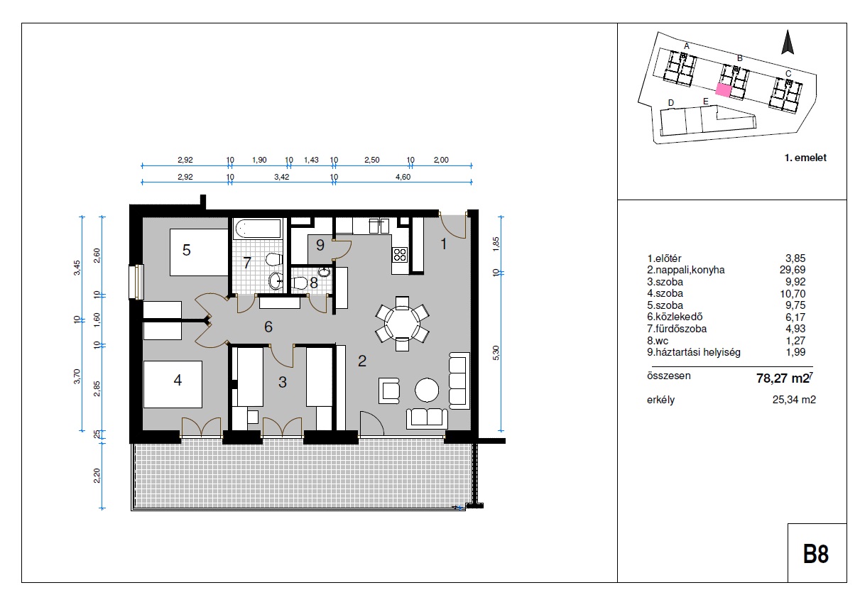 A jelen adatok tájékoztató jellegűek, ezért a Beruházó azok változásával, vagy bármely attól való eltéréssel kapcsolatban semmilyen kötelezettséget, vagy felelősséget nem vállal. Az ábrázolt berendezési tárgyak és bútorok, a burkolatok megjelenése nem képezi a szerződés tárgyát. A pontos felszereltség műszaki leírás szerint. A területek burkolatlan felületekre értendőek. A nettó területek helyiségeknek a falak közötti területei. A bruttó területek tartalmazzák a válaszfalak alatti területet. Jelen rajzon szereplő méretek a kiviteli tervek szerint módosulhatnak.